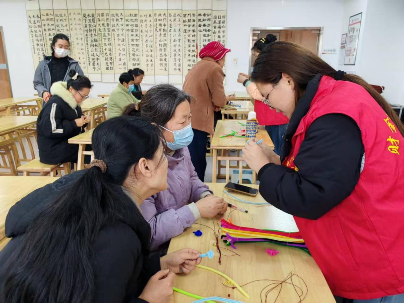 活动伊始,在大学生们轻松活泼的引导下,一场“数字炸弹”破冰游戏迅速拉近了彼此的距离,消除了初见的陌生感,居民们在与年轻学子的互动中重拾童趣,现场气氛瞬间升温。随后的手工体验环节成为活动的核心亮点。在大学生分步讲解与手把手指导下,居民们沉浸于手工创作的乐趣之中,巧手翻飞间,一条条红绳在编织技法与精美珠子的串联下,成为独具个性的手链或项链;色彩缤纷的扭扭棒则在指尖缠绕、弯曲,变身为生动有趣的花朵或创意装饰。整个过程中,大学生不仅传授着手工技艺,更扮演着鼓励者与陪伴者的角色。他们与居民并肩而坐,共同探讨设计,分享创作灵感,其专业的服务态度与青春的活力深深感染了在场的每一个人。
