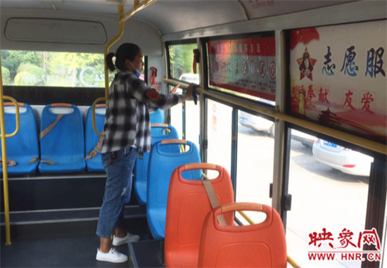 公交车长6路徐小凤正在打扫车内卫生