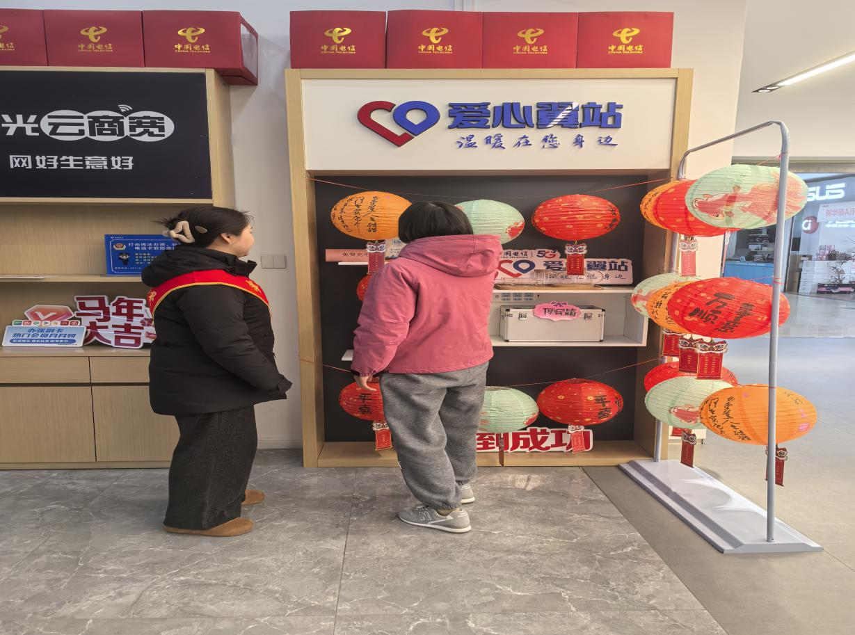 活动现场,“爱心翼站”区域被装点得焕然一新,数十盏灯笼高高悬挂,谜面内容丰富多样,既涵盖传统字谜、成语典故、元宵民俗,又融入反诈知识、生活常识等元素,兼具趣味性与知识性。在欢度节日的同时,安全守护与温情服务同步贴心在线。赢得了参与活动的用户的一致点赞,让用户在办理业务的同时,更多的感受到中国电信对用户的深切关爱。