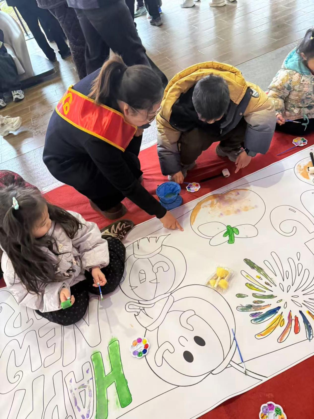 活动现场喜气洋洋、热闹非凡。在长卷绘画区,孩子们围坐一起,拿起五彩画笔,共同描绘心中的元宵美景,灯笼、圆月、快乐小马、烟花等元素跃然纸上,童真满满、爱意浓浓。另一边的猜灯谜区域吸引了众多家长踊跃参与,谜面趣味十足,大家驻足思考、互相探讨,在欢声笑语中感受传统民俗的独特魅力。